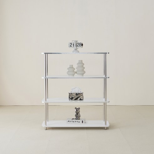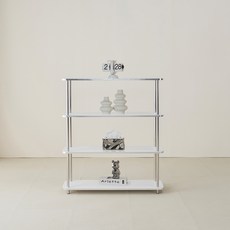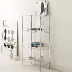 스테인리스 프레임과 투명 유리 선반으로 세련된 미드센추리 감성을 연출하며 4단 구조로 다양한 소품을 깔끔하게 진열하고 공간을 넓어 보이게 하는 실용적인 선반