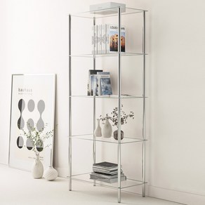 스테인리스 프레임과 투명 유리 선반 조합으로 세련된 분위기를 연출하며 5단 구조로 다양한 소품을 넉넉하게 진열하고 공간을 깔끔하게 정리하기 좋은 실용적인 선반